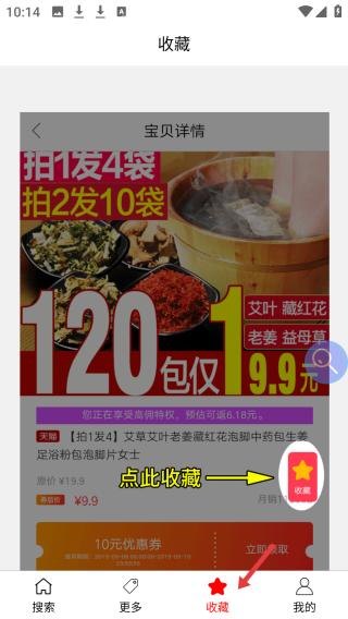 3、點擊收藏界面商品詳情,如艾葉泡腳中藥包優惠活動,設收藏提示與優惠券領取,方便管理心儀商品。