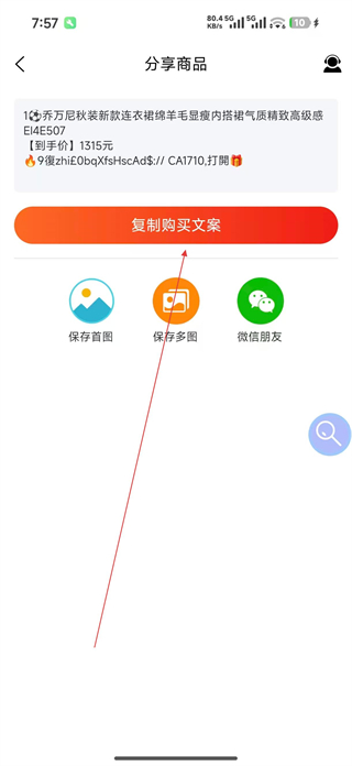 4、進入分享商品頁面,可點擊復制購買文案獲取商品鏈接,也能選擇保存圖片微信朋友等渠道分享商品。