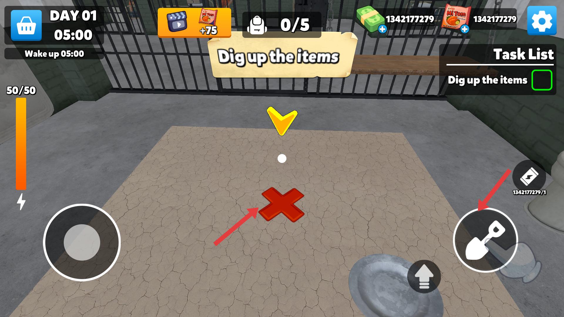 3、看到地面紅色叉號標記,點擊右側鏟子圖標,開始挖掘,獲取地下物品。