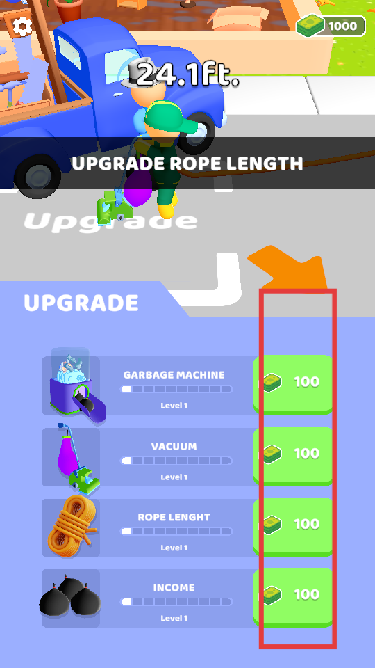 4、最后進入升級界面,這里有垃圾處理機、吸塵器、繩索長度、收入等可升級選項,升級后垃圾處理機等工具的清潔效率、繩索長度等會得到提升。