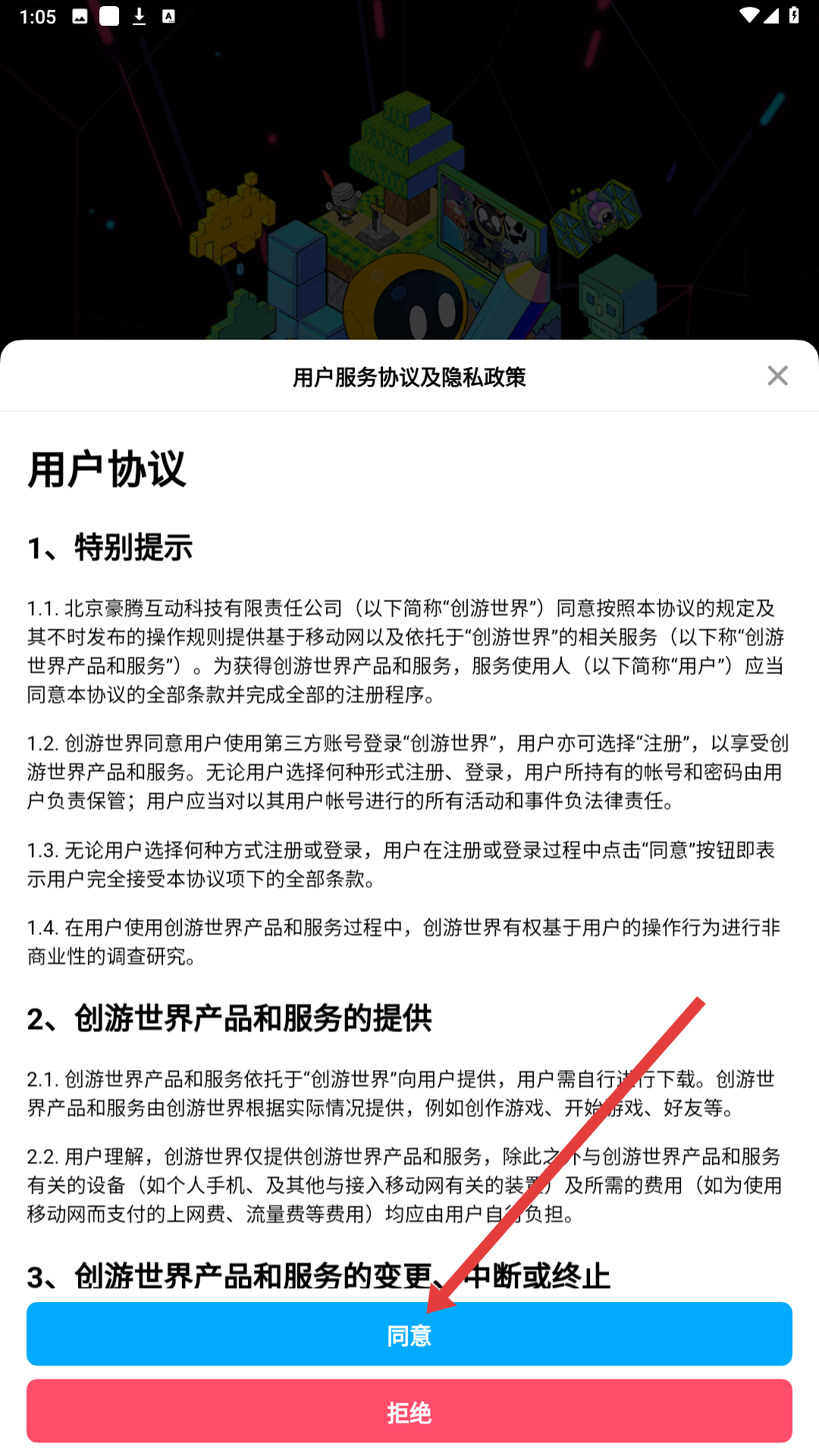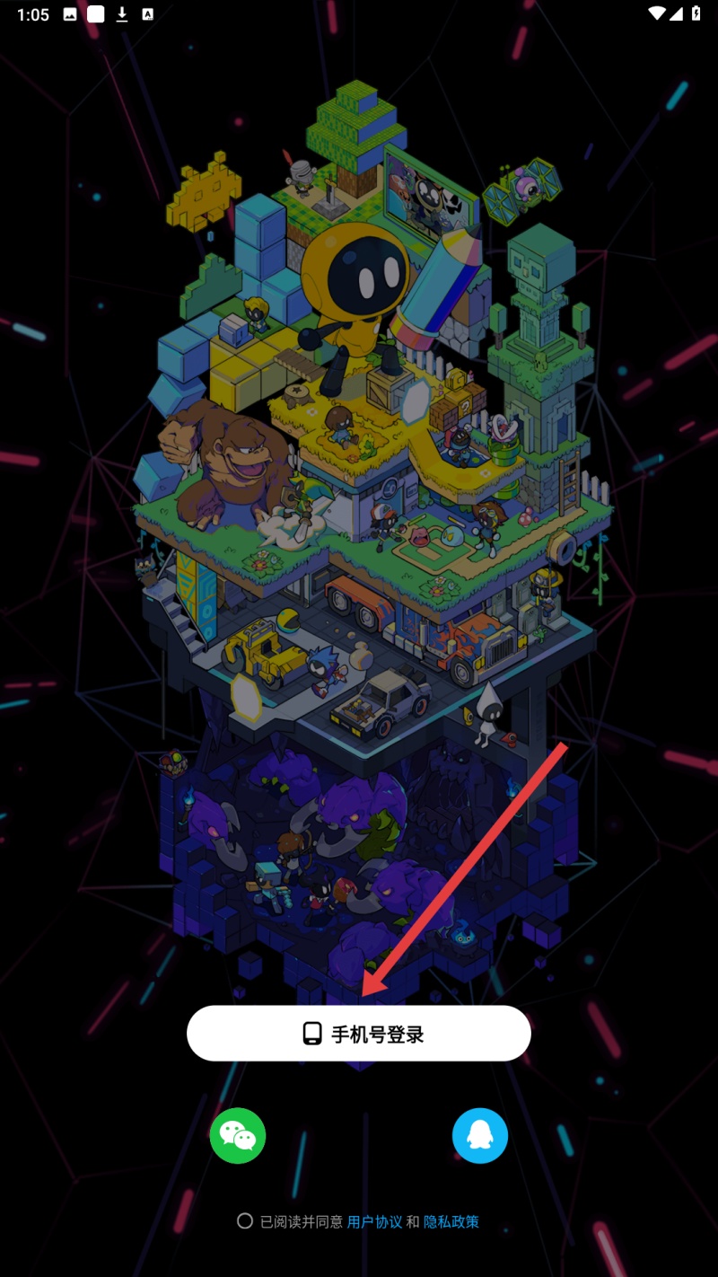 1、進入創游世界登錄界面,可選擇手機號登錄,也可通過微信、QQ登錄,登錄前需閱讀并同意用戶協議和隱私政策。