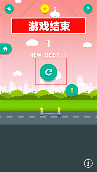 4、如果未能成功接住人員,游戲會結束并顯示游戲結束界面,此時可以點擊重置按鈕,重新開始游戲。