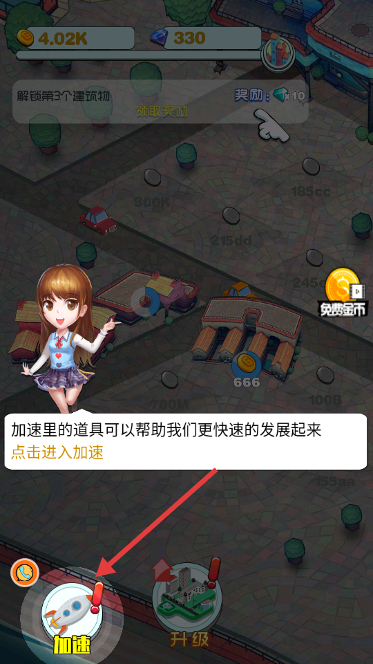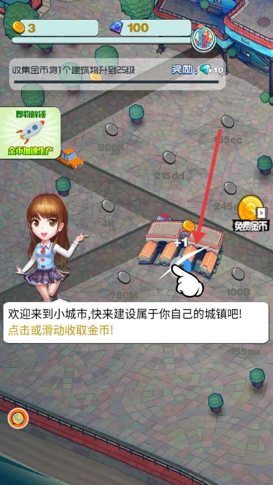 1、首先可以通過收取建筑產出的金幣來賺錢,進入游戲后能看到建筑上會出現金幣標識,點擊或滑動建筑就能收取金幣,這些金幣是游戲初期的主要收入來源。
