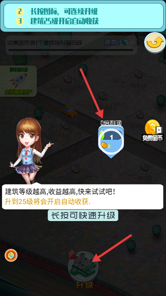 2、其次升級建筑能提升金幣收益,長按建筑圖標可連續升級,建筑等級越高單位時間內產出的金幣就越多,當建筑升到25級時,還會開啟自動收獲功能。