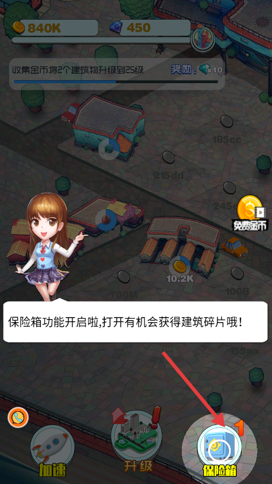 4、最后開啟保險箱也能獲得賺錢相關的獎勵,點擊保險箱按鈕有機會獲得建筑碎片,這些建筑碎片可用于解鎖新建筑或升級現有建筑,能帶來更多金幣收益。