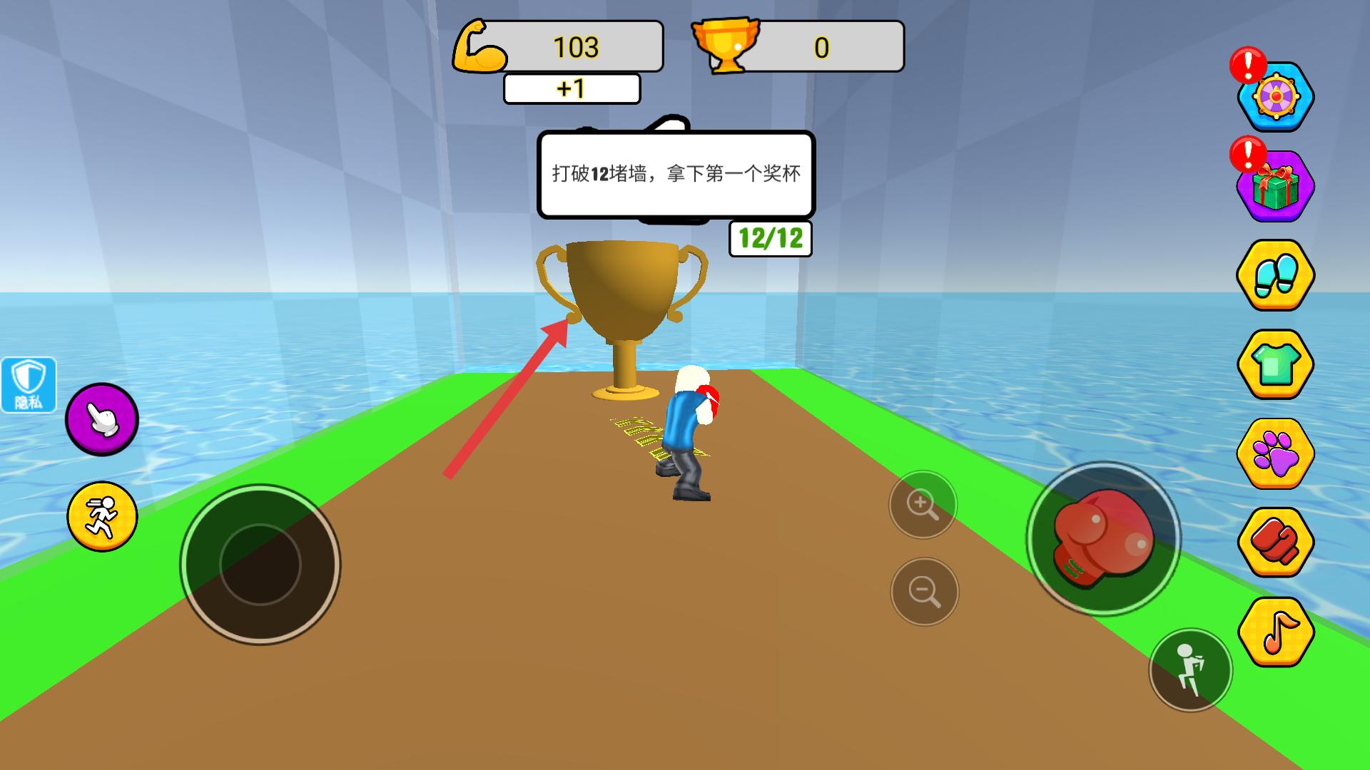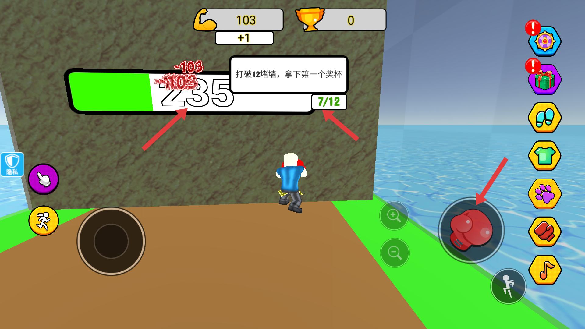 3、需打破12堵墻拿獎杯,操控角色用拳擊手套打擊墻體,每次打擊會削減墻體耐久,逐步推進破墻進度。