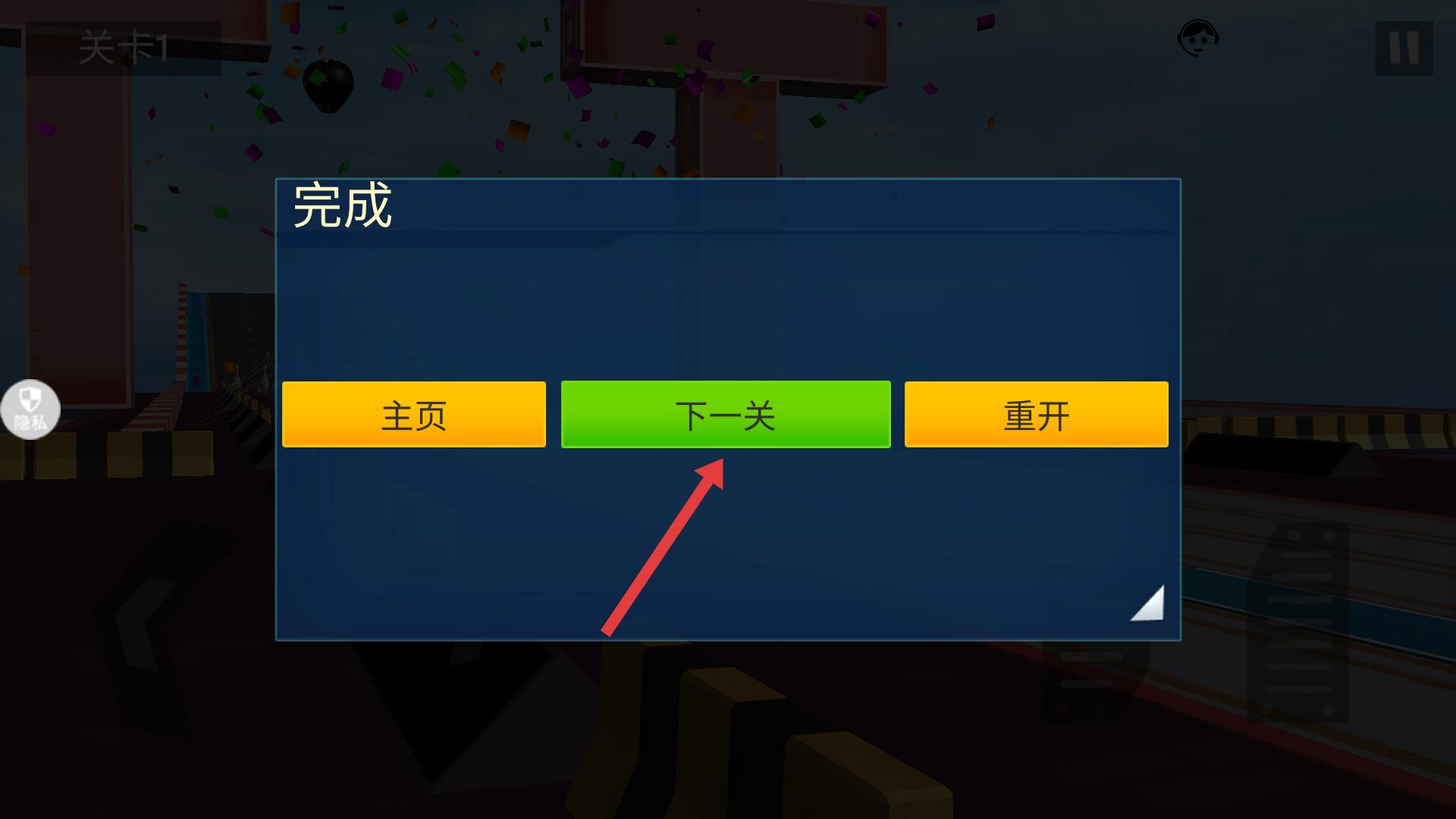 4、成功到達關卡1的終點后,會出現完成提示界面,此時點擊下一關按鈕,即可進入下一個關卡,繼續駕駛挑戰。