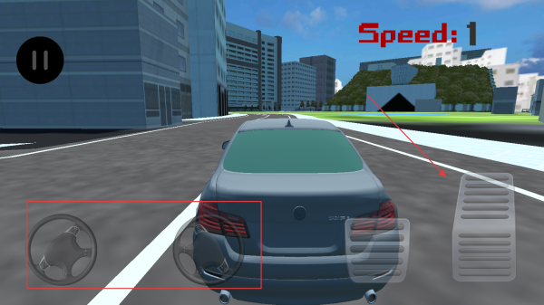 3、進入駕駛場景后,通過屏幕左側的方向盤按鈕控制車輛的行駛方向,利用右側的油門和剎車踏板調整車速,在城市道路等場景中模擬真實駕駛。