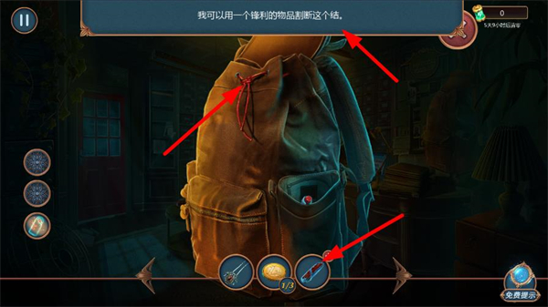 3、用鋒利物品割斷背包的結,選好道具欄里的鋒利物品,對背包的結進行操作,完成割斷動作推進流程。