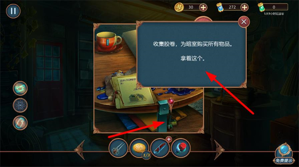 4、提示收集膠卷為暗室購買物品,找到膠卷,操作拾取該物品,按提示拿取后繼續推進游戲進程。