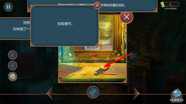 2、提示拾取硬幣,在場景里找到對應的硬幣物品,點擊進行拾取,將其收集到道具欄,積累可用道具。