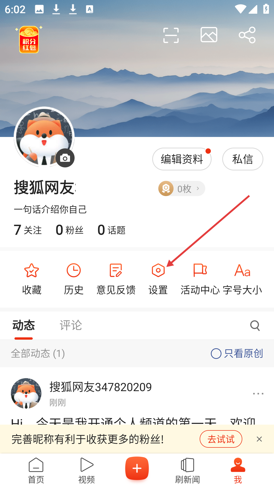 在搜狐新聞首頁下方的菜單欄中選擇我的