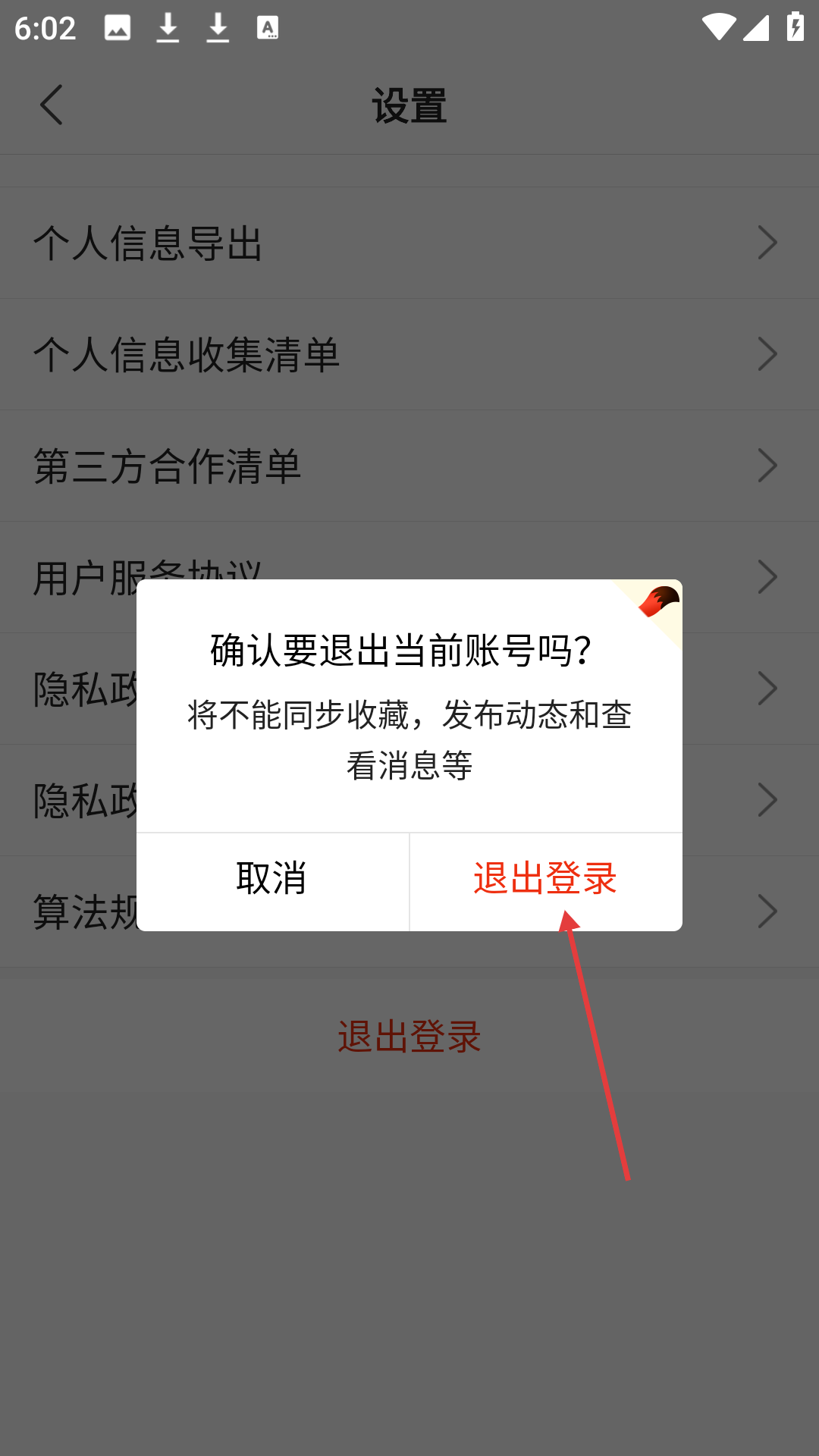 2、在設置頁面向下滑動屏幕,直至看到退出登入選項,點擊后會彈出確認提示框,告知退出后無法同步收藏、發布動態等影響,確認是否執行退出操作。