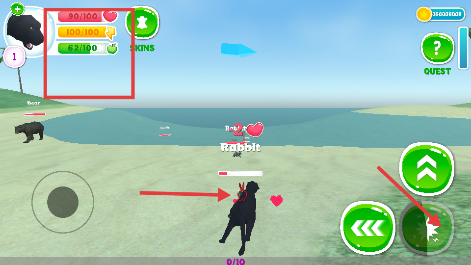 3、然后遇到兔子等動物時,可點擊攻擊按鈕讓黑豹發起攻擊,戰斗中要留意黑豹的生命、體力等數值,合理利用攻擊技能,成功擊敗動物可獲得獎勵。