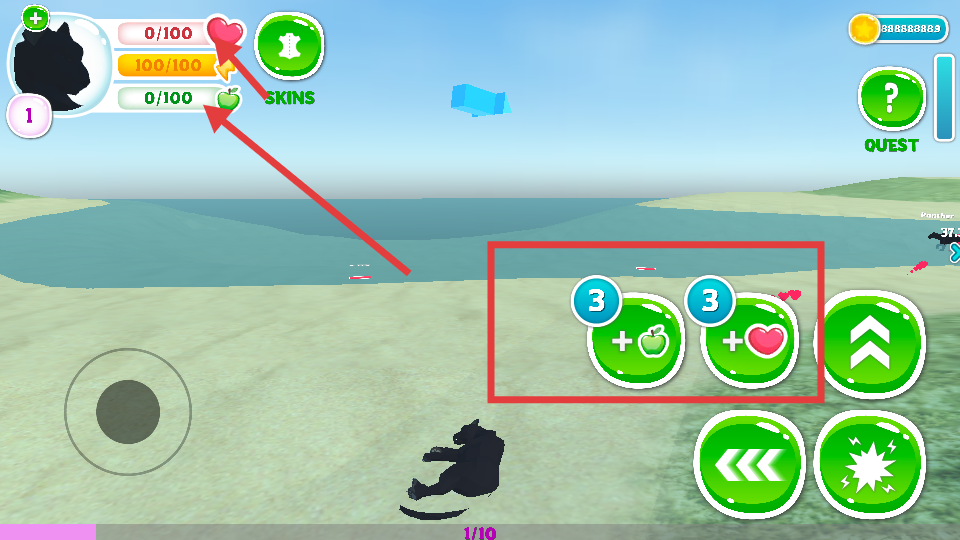 4、若黑豹生命或體力值下降,可點擊界面右側的蘋果、愛心圖標來補充,這些道具能恢復黑豹的生命與體力,讓黑豹保持良好狀態,繼續在野外生存、探索。