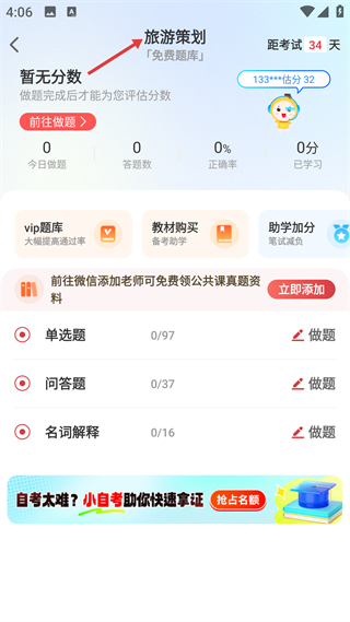 2、首頁,屬旅游管理專業學習入口,有免費題庫、歷年真題等工具,也有VIP題庫、考前押密等增值服務,含畢業申請代辦。