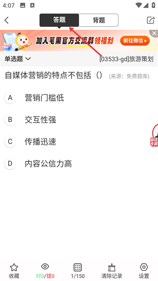 4、答題界面,有答題和背題模式,當前是單選題,答案為D,因自媒體營銷特點不含內容公信力高,多由個人創作。