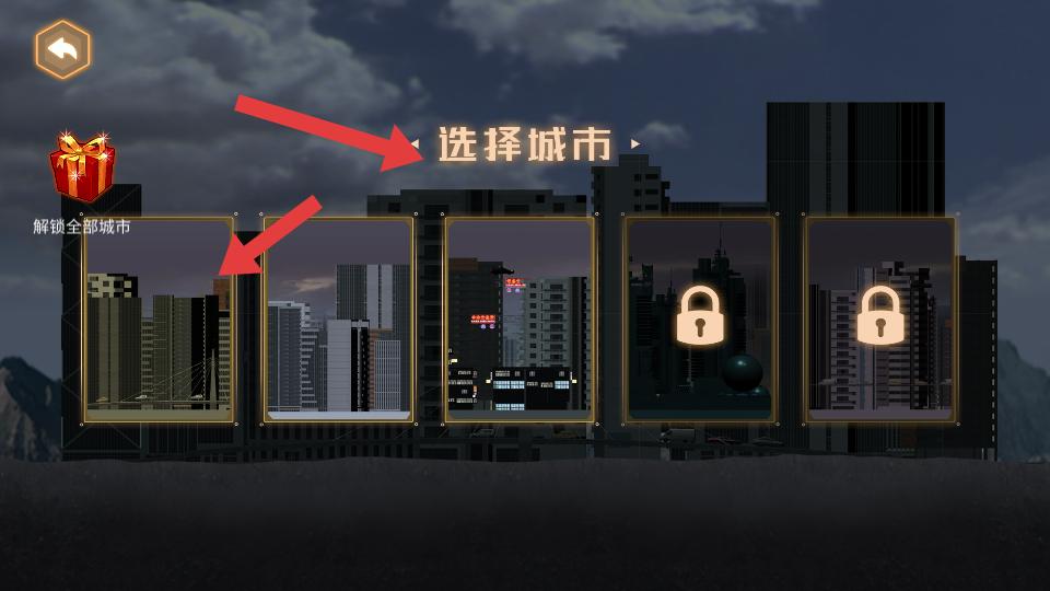 2、進入選擇城市界面,有多個城市選項,部分城市帶鎖,選擇已解鎖的城市,進入該城市場景。