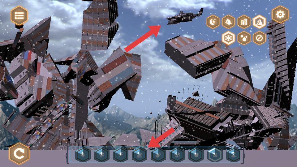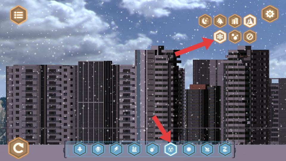 3、在城市場景,上方有天氣,建筑等切換圖標,下方有各種破壞工具,選擇工具,可改變城市天氣或對建筑進行操作。