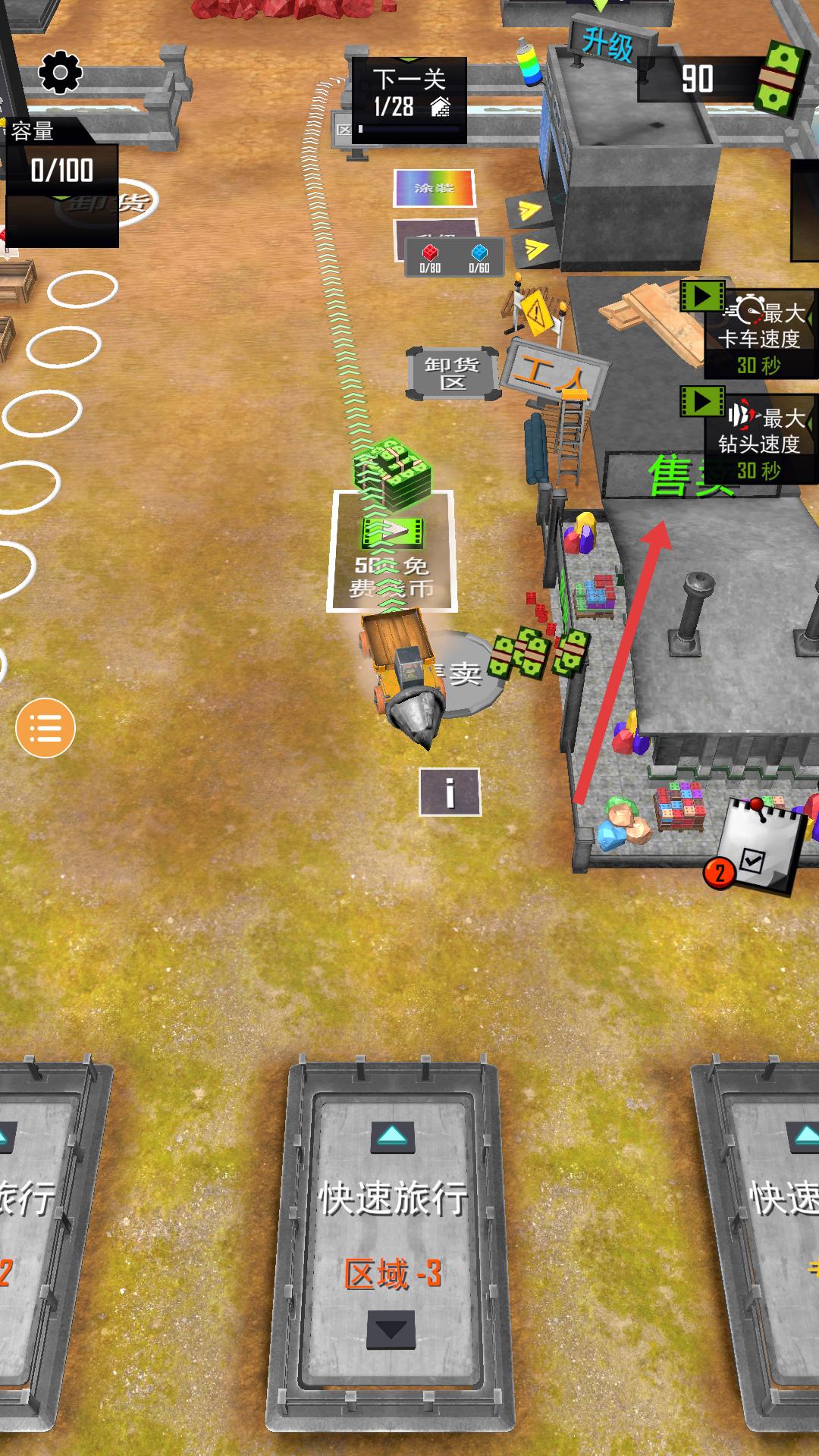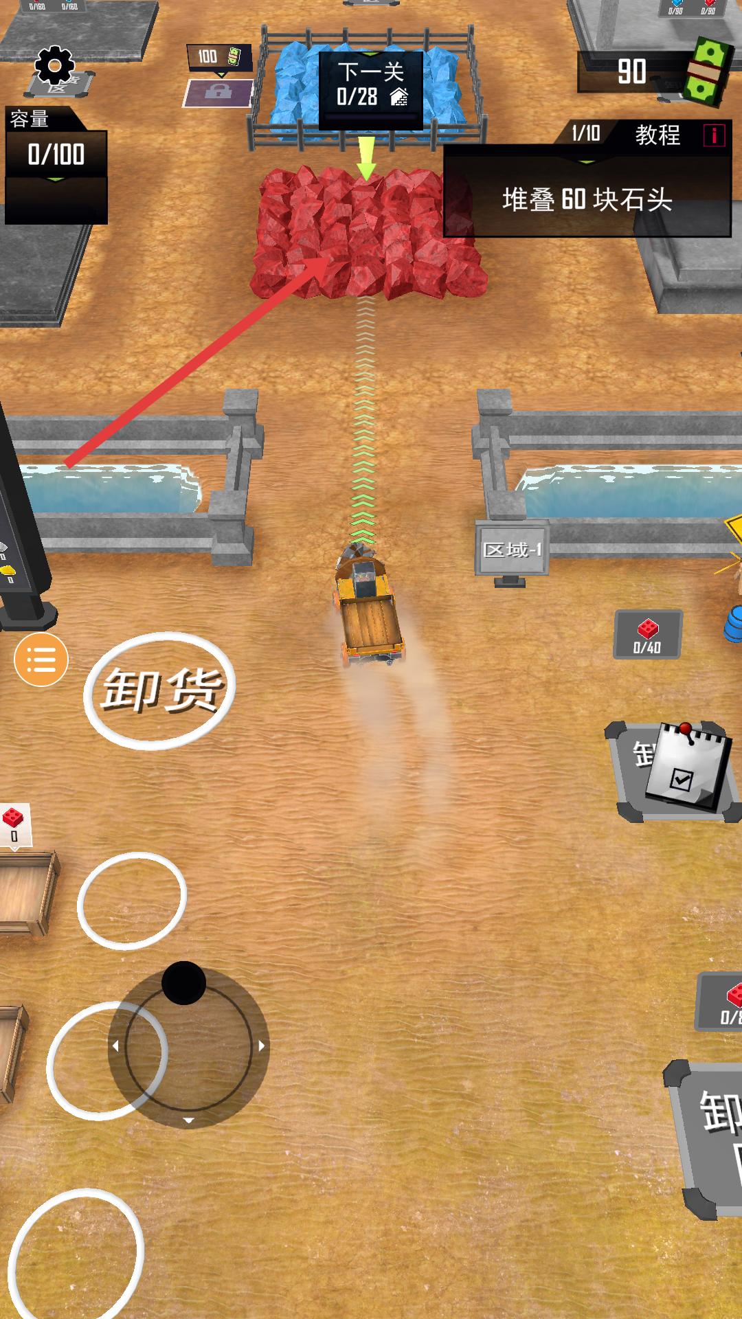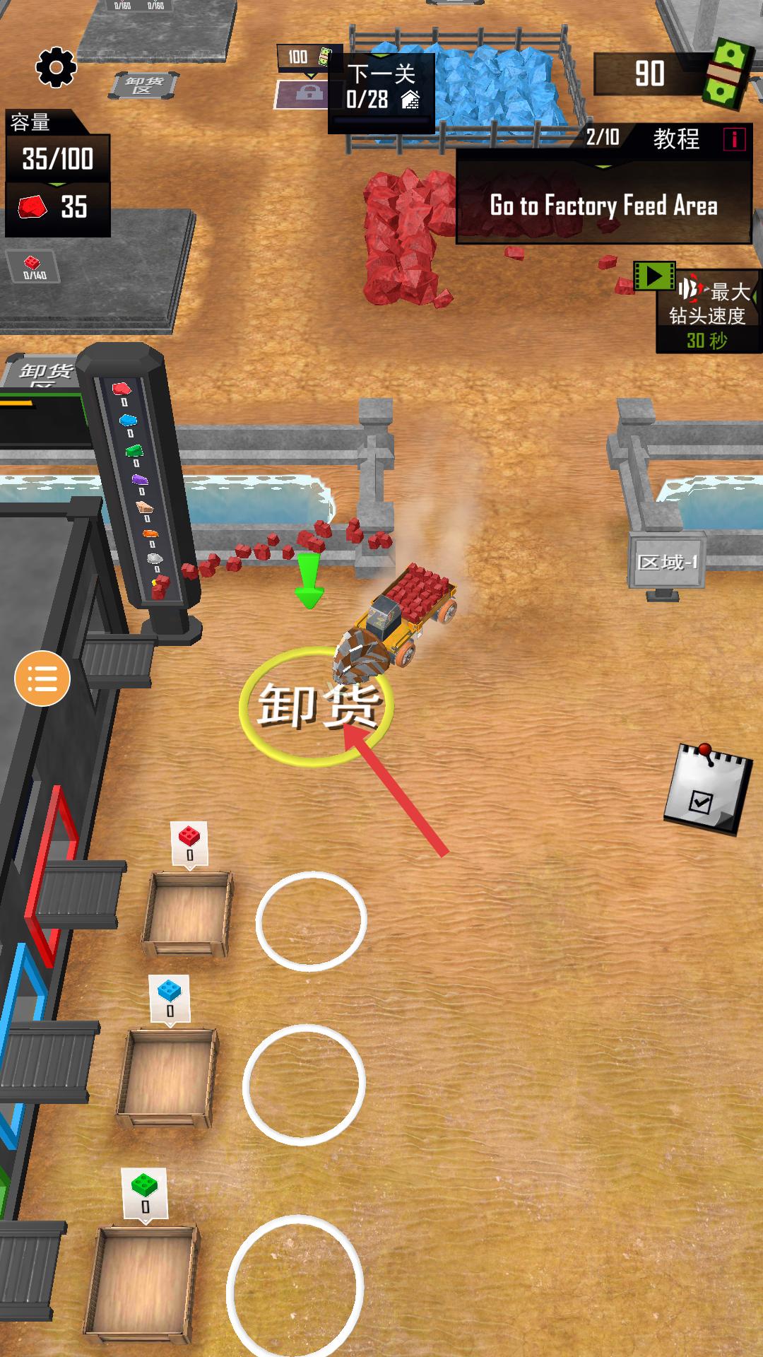 2、車輛裝載石頭后,駕駛到標有【卸貨】的圓圈區域,進行卸貨操作,完成貨物交付,為后續流程做準備。