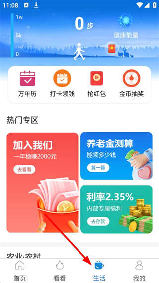 4、生活界面,可查看步數、健康能量,使用萬年歷、打卡領錢等功能,熱門專區有加入我們、養老金測算等內容,方便用戶了解生活服務和福利信息。