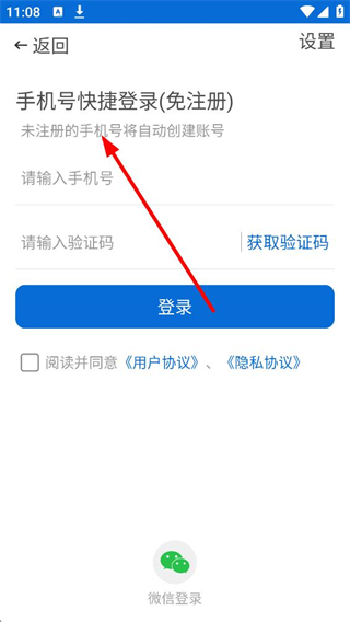 3、手機號快捷登錄界面,輸入手機號和驗證碼,勾選閱讀并同意用戶協議和隱私協議后點擊登錄即可,未注冊的手機號將自動創建賬號。