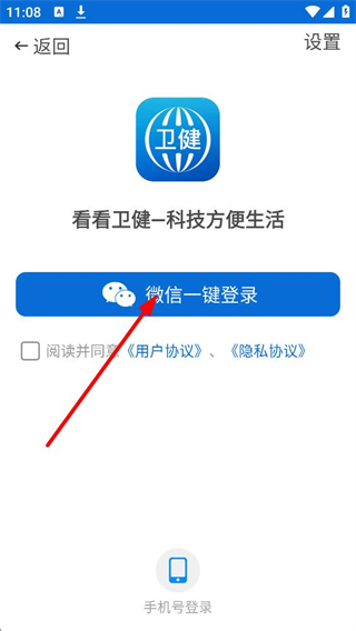 2、登錄界面,可選擇微信一鍵登錄,勾選閱讀并同意用戶協議和隱私協議后即可登錄,也可選擇手機號登錄方式。
