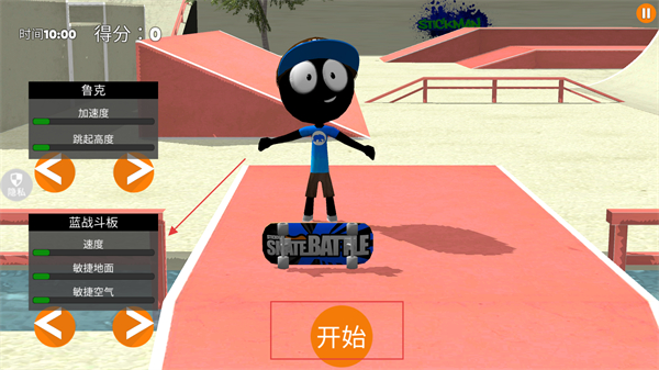 2、玩家可以挑選喜歡的角色和滑板后,然后根據圖標點擊開始的按鈕,開啟滑輪跑酷之旅。