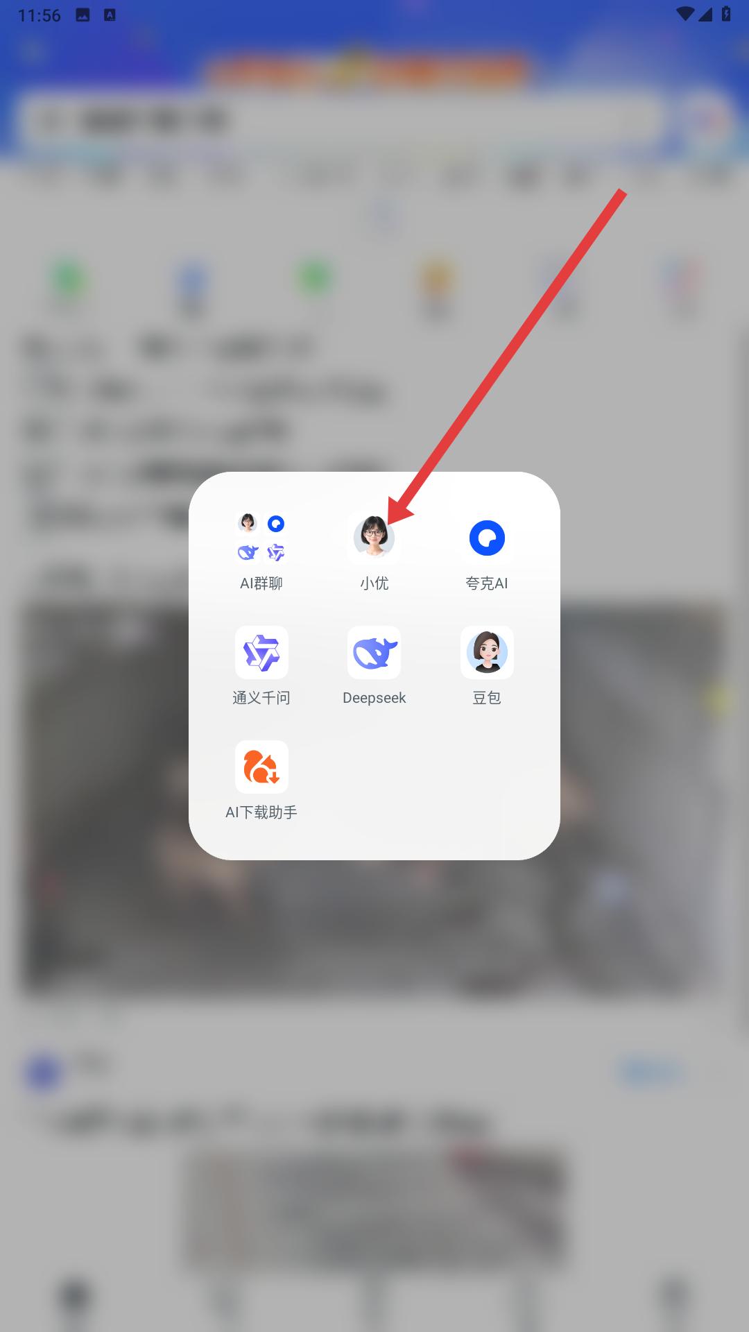 2、彈出的AI功能選擇界面中,找到小優選項,點擊小優,進入與小優的聊天頁面。