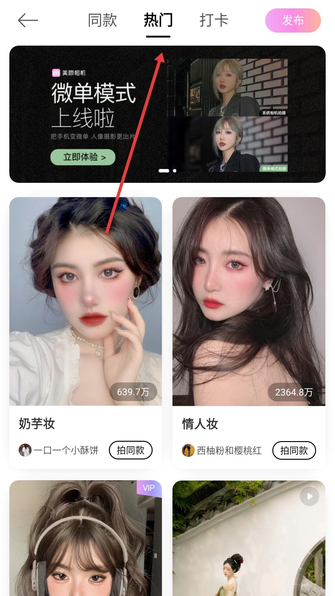 3、登錄后進入熱門內容頁面,能看到微單模式等推薦內容,還有奶芋妝、情人妝等熱門妝容模板,可瀏覽這些內容。