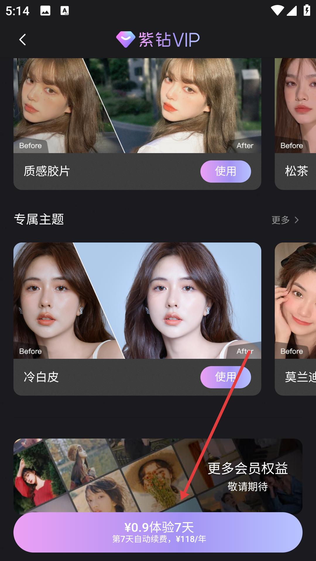 1、進入紫鉆VIP頁面,可看到質感膠片、冷白皮等專屬主題,還有會員體驗活動,若要體驗會員,點擊相關體驗按鈕。