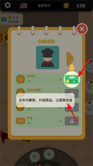 3、打開菜品界面,點擊升級按鈕可解鎖升級菜品,比如脆雞堡等,升級后菜品收益會提高,助力積累更多游戲內的資源。
