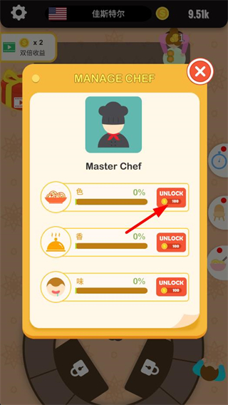 4、進入廚師管理界面,點擊解鎖按鈕可解鎖廚師的色香昧屬性,每個屬性解鎖需消耗對應資源,提升后可優化菜品表現。