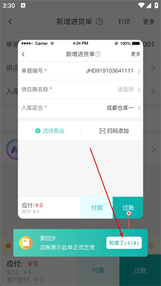 2、新增進貨單頁面,閱讀進貨須知,閱讀完后點擊知道了。