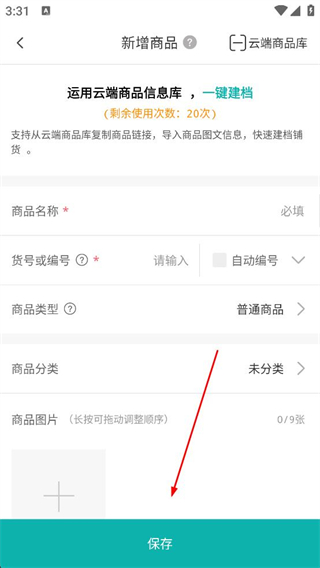 4、在新增商品頁面填寫商品名稱貨號或編號,選擇商品類型和分類,還可上傳商品圖片,完成信息填寫后點擊保存按鈕。