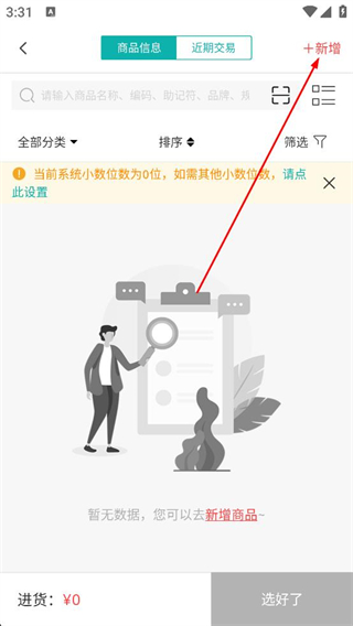 3、在新增進貨單頁面點擊選擇商品按鈕,進入商品信息頁面,可點擊新增按鈕,進入新增商品頁面補充商品信息。