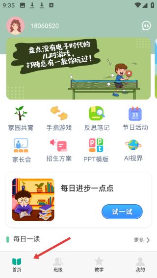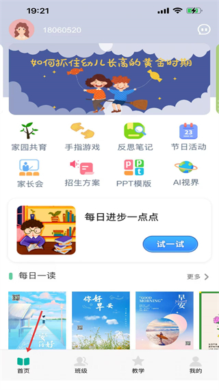 1、進入首頁可看到家園共育手指游戲等功能入口,還有每日一讀板塊,點擊對應功能即可進入相關幼教內容的查看與使用。