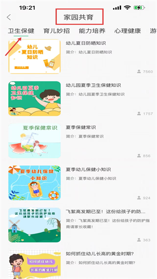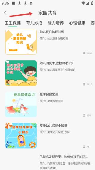 2、點擊家園共育頁面,涵蓋衛生保健等多類育兒資訊,如幼兒夏日防曬知識等,助力家長科學育兒。