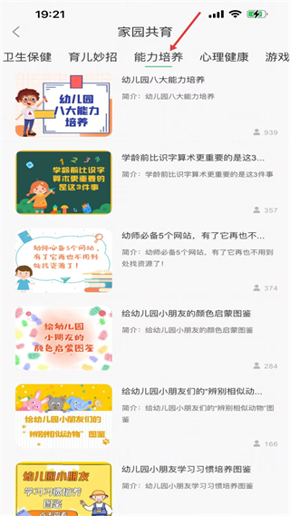 4、切換到家園共育的能力培養板塊,可查看幼兒園能力培養等內容,獲取幼兒能力提升的相關指導與資源。