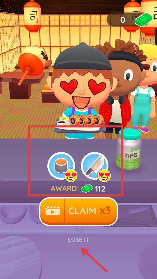 4、當顧客對壽司滿意后就可以獲得獎勵,界面會顯示獲得的金幣等獎勵數量,你可以選擇領取獎勵,繼續下一份壽司的制作,不斷提升壽司制作技藝和收益。