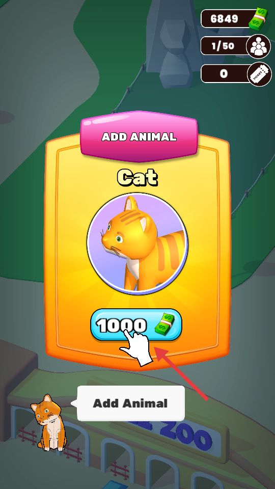 1、進入動物園管理游戲,你可以點擊ADD ANIMAL,花費一定金錢購買新動物,比如花1000購入小貓,豐富動物園的動物種類,吸引更多游客前來參觀。