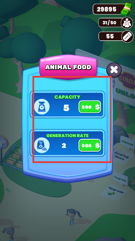 4、玩家在ANIMAL FOOD界面,可花費游戲貨幣升級食物容量和生成速率,升級后能存儲更多食物,更高效地為動物提供食物,保障動物園的穩定運營。