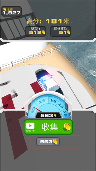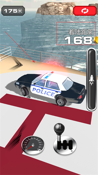 3、汽車跳躍后關注著陸距離的顯示,嘗試讓汽車在合適的位置著陸,避免因著陸位置不當導致游戲失敗,成功即可獲得金幣。