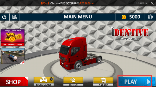 1、玩家下載進入在游戲主界面,點擊PLAY按鈕進入游戲模式選擇界面,準備開始貨物卡車停車場的挑戰。