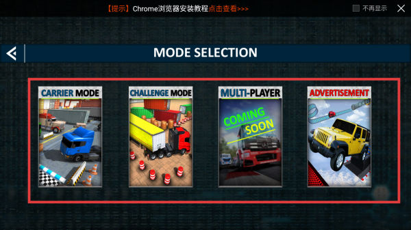 2、在模式選擇界面,可選擇CARRIER MODE運輸模式、CHALLENGE MODE挑戰模式等不同模式,不同模式有著不同的卡車駕駛與停車任務和規則。