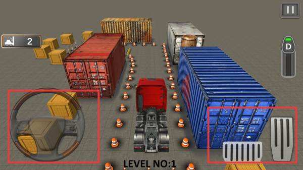 3、進入停車場場景后,通過屏幕左側的方向盤控制卡車的行駛方向,右側的踏板控制卡車的加速與減速,精準操控卡車移動。