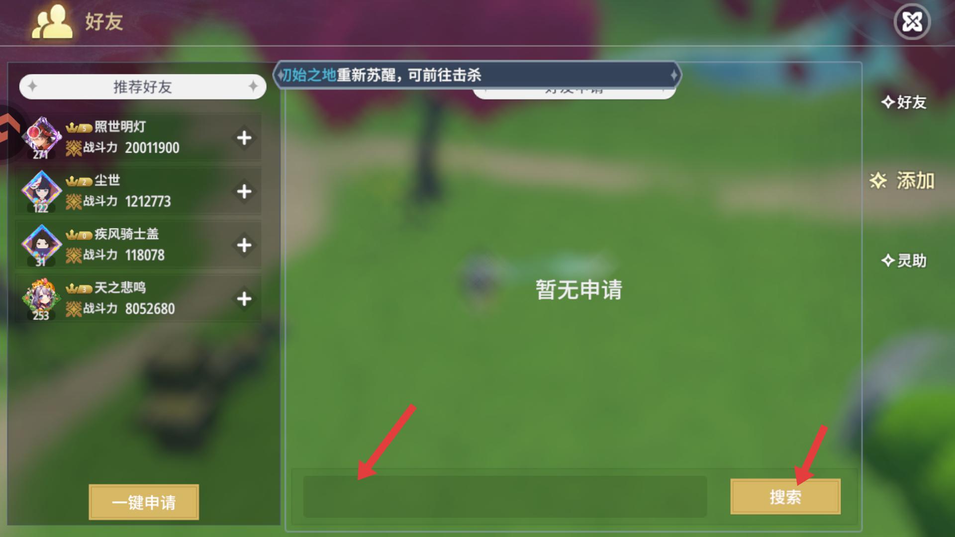 4、進入添加好友界面后,可通過推薦好友列表選擇,也能使用搜索功能查找特定玩家,還能一鍵申請添加推薦好友。