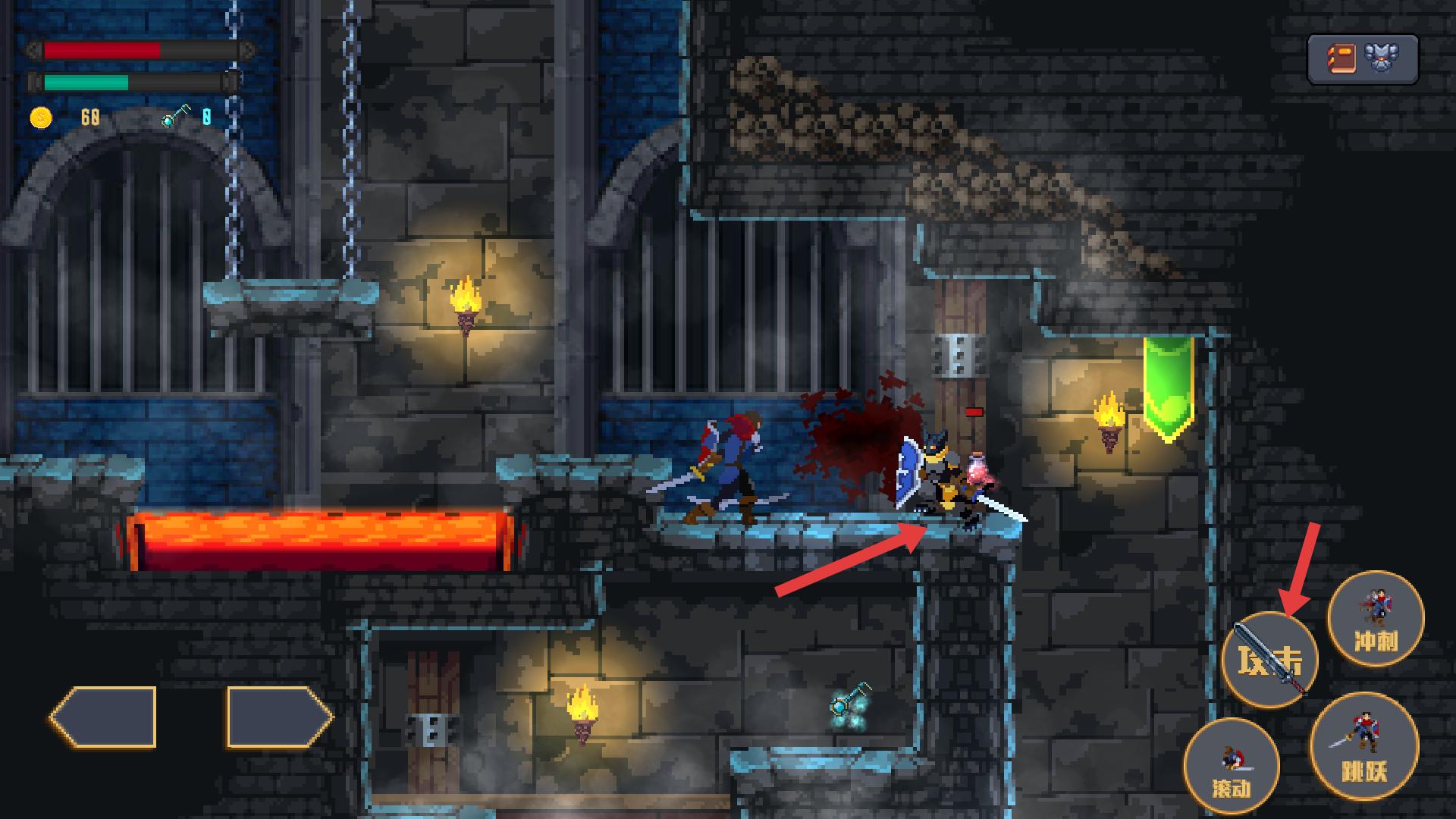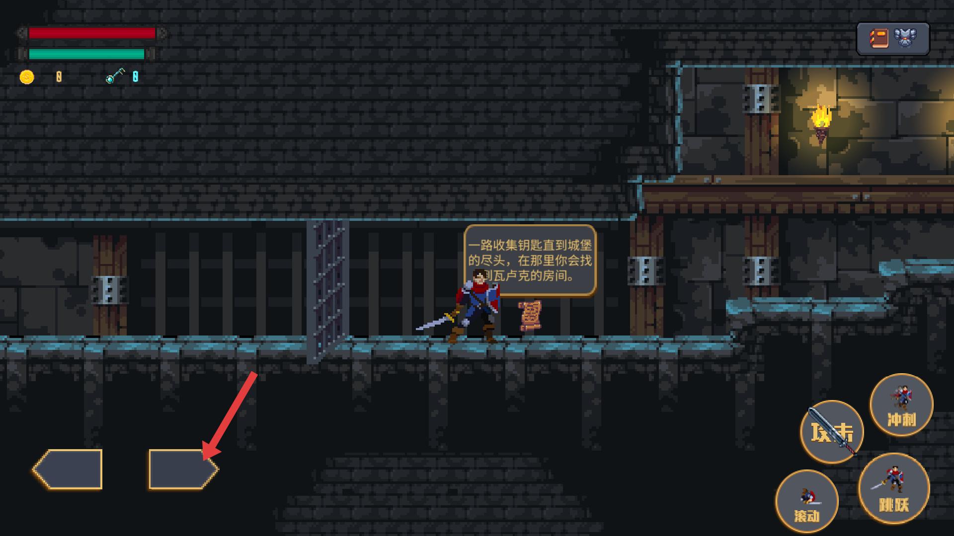 2、進入城堡場景后,利用左側方向鍵操控角色移動,右側攻擊、沖刺等按鍵輔助行動,按提示收集鑰匙,推進游戲。