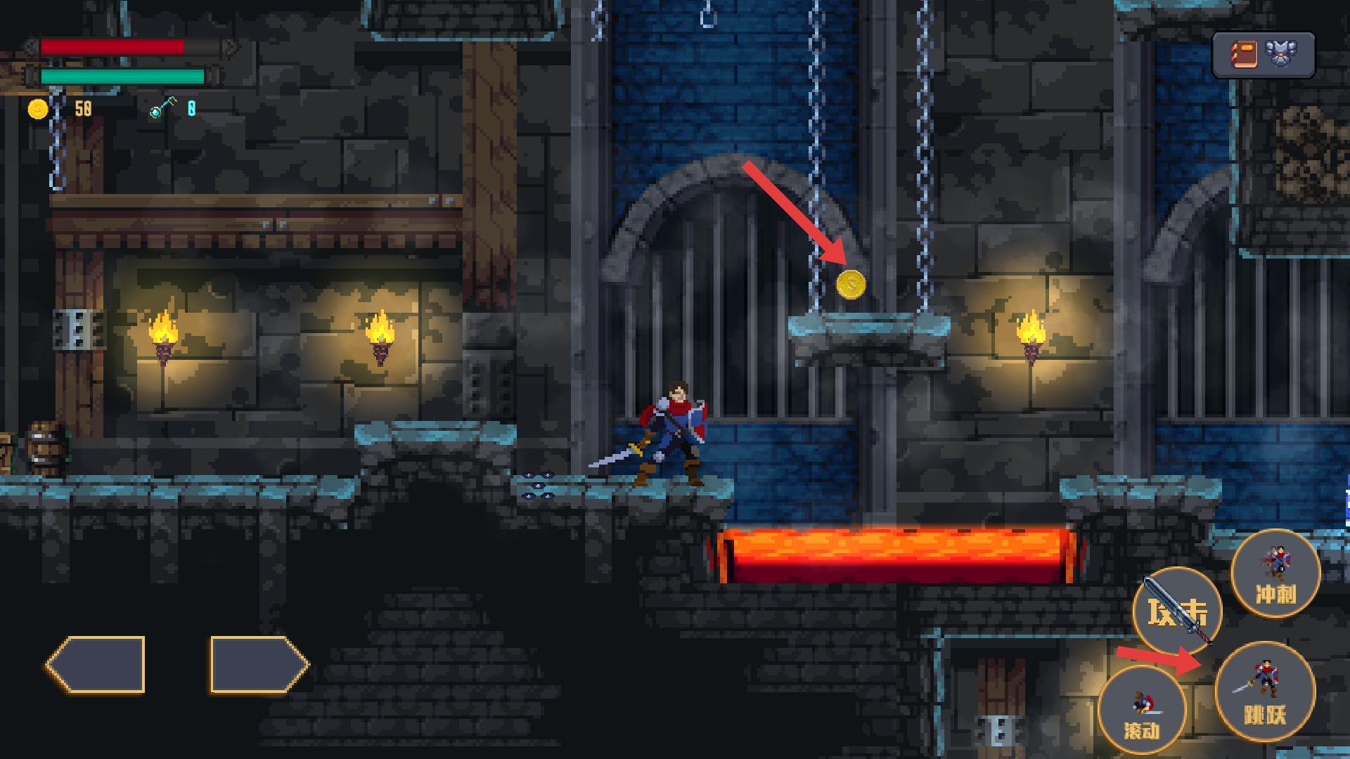 3、遇到金幣時,可操控角色,借助跳躍按鍵,跳到對應位置獲取金幣,同時注意躲避如巖漿等危險區域。