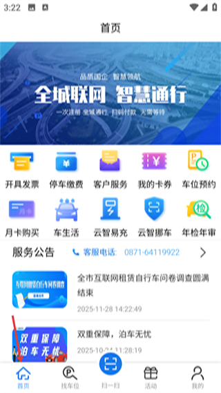 1、首頁,屬國企平臺,提供停車繳費等功能,含發票開具等工具,同步公告,實現全城聯網智慧通行。